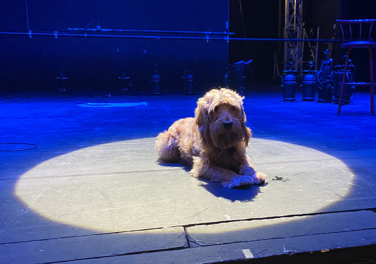 In this Oxford University student production of The Two Gentlemen of Verona, Crab is played by the marmalade cockerpoo, Rocky. Calm and caring in nature, he has become a beloved figure at Oxford Playhouse, growing very familiar with backstage life as he rubs shoulders (and heads) with the crew.